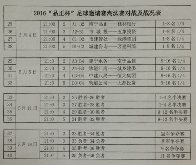 1/4淘汰賽將于54日進(jìn)行,分別由A組第一南寧品正對(duì)B組第二桂林銀行、A組第二市城投對(duì)B組第一五象投資、C組第一市建管處對(duì)D組第二綠港集團(tuán)、C組第二區(qū)建科院對(duì)D組第一市城建咨詢。