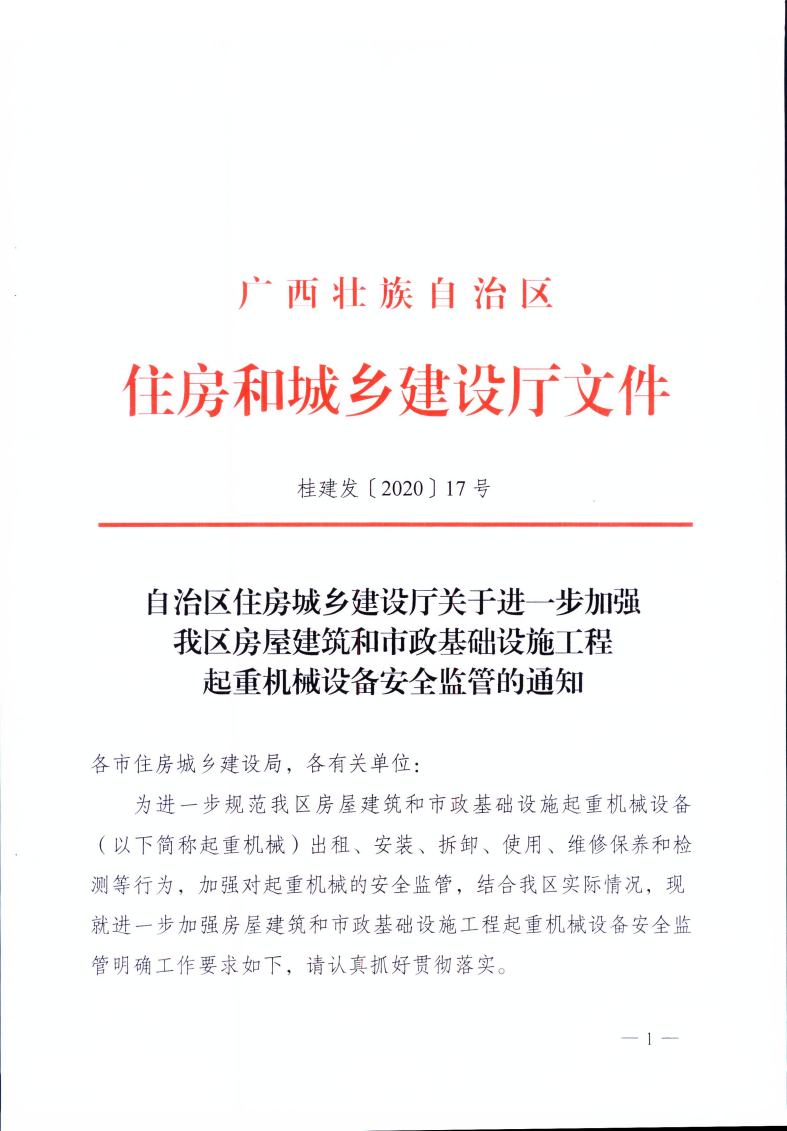 自治區(qū)住房城鄉(xiāng)建設(shè)廳關(guān)于進一步加強我區(qū)房屋建筑和市政基礎(chǔ)設(shè)施工程起重機械設(shè)備安全監(jiān)管的通知— —桂建發(fā)〔2020〕17號