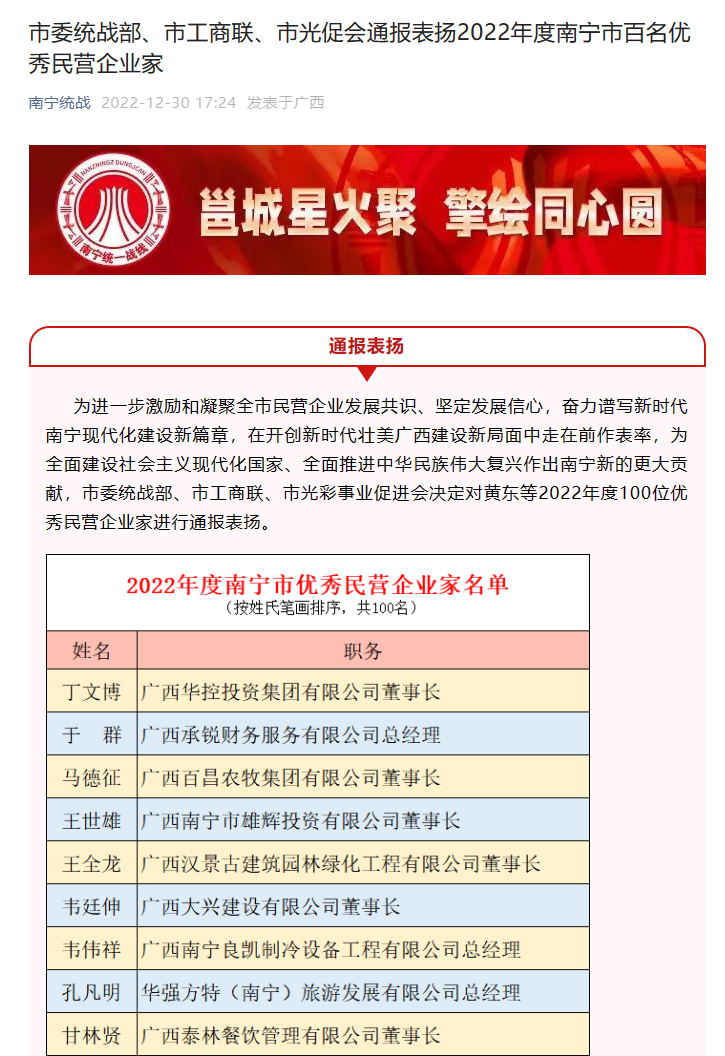 2022年12月30日,南寧市委統(tǒng)戰(zhàn)部、南寧市工商聯(lián)、南寧市光彩事業(yè)促進(jìn)會(huì)決定對(duì)2022年度100位優(yōu)秀民營企業(yè)家進(jìn)行通報(bào)表揚(yáng),共評(píng)出一百名優(yōu)秀民營企業(yè)家。他們是南寧市民營企業(yè)家的優(yōu)秀代表,體現(xiàn)了新時(shí)代民營經(jīng)濟(jì)代表人士的風(fēng)范和擔(dān)當(dāng)。
