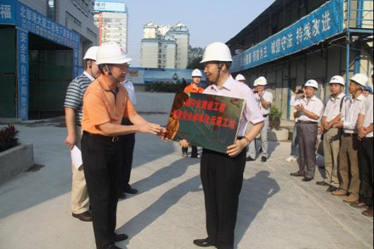 南寧市建筑管理處黨委書記馮仕文(左)授牌,區(qū)五建項(xiàng)目經(jīng)理接牌