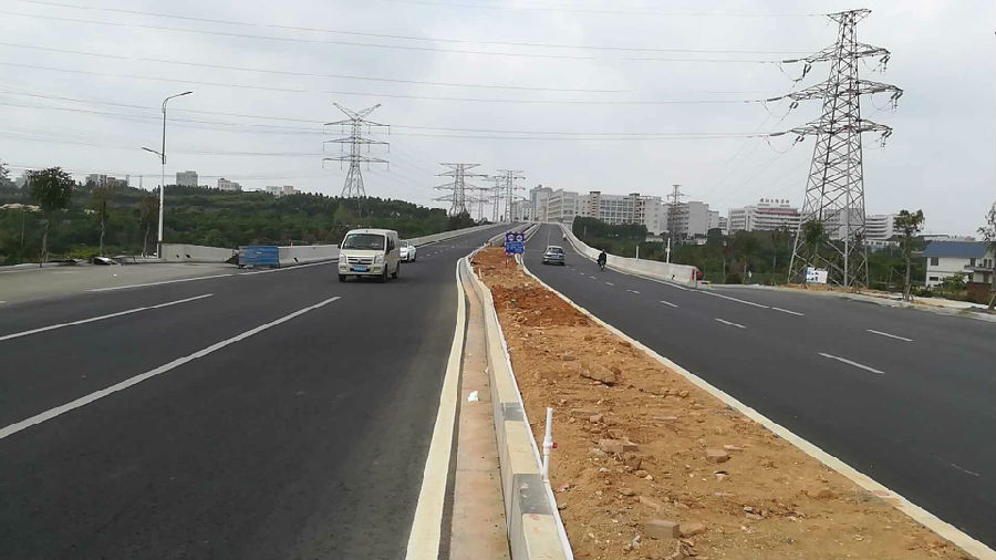 湛江市南方路道路排水及跨線橋新建工程橋梁人行道完成80%,南方路人行道完成50%,綠化完成75%: