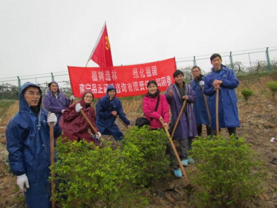 植樹節(jié)前夕,南寧品正團委組織10名團員青年,在相思湖可利江公園邊,會同市直機關(guān)及南寧市的1500多名團員青年共同參加由自治區(qū)綠化委、共青團廣西區(qū)委、林業(yè)廳主辦的“綠滿八桂 綠動青春——2011年廣西青少年綠色基地建設(shè)推進月暨綠映水城首府青年大種樹活動啟動儀式”,短短一個上午,南寧品正青年志愿者們和大家一起共種植樹木300多株,為綠城建設(shè)生態(tài)文明城市又增添一抹新綠,以實際行動推動城鄉(xiāng)造林綠化,建設(shè)生態(tài)文明家園。