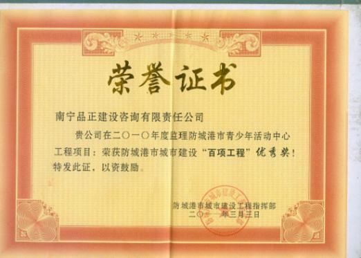 2011年3月3日,南寧品正負(fù)責(zé)監(jiān)理的防城港市青少年活動(dòng)中心工程榮獲防城港市城市建設(shè)工程指揮部授予的2010年度防城港市建設(shè)“百項(xiàng)工程”優(yōu)秀獎(jiǎng)。南寧品正將繼續(xù)踐行“科學(xué)規(guī)范、承諾守信、嚴(yán)格監(jiān)理”質(zhì)量方針,達(dá)到“履行監(jiān)理合同,提供滿意服務(wù)”的質(zhì)量目標(biāo)。