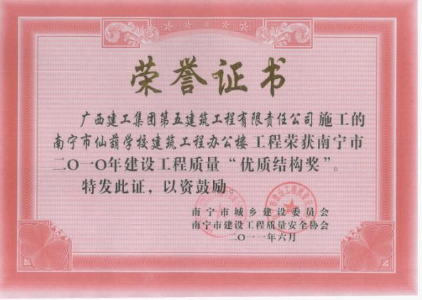 南寧市仙葫學校建筑工程辦公樓榮獲南寧市二〇一〇年建設工程質量“優(yōu)質結構獎”榮譽證書